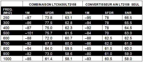 Le tableau 1 affiche la dégradation minimale des SNR et SFDR pour ce convertisseur A/N haute vitesse et haute résolution. La haute linéarité et le faible bruit du LTC6430-15 permettent au concepteur de commander le convertisseur A/N avec un filtrage minimum à l’entrée du convertisseur. Toutes les mesures sont effectuées sur un circuit d’application unique sans réglage des réseaux d’adaptation. Ceci confirme les performances de bande passante et de linéarité du LTC6430-15.